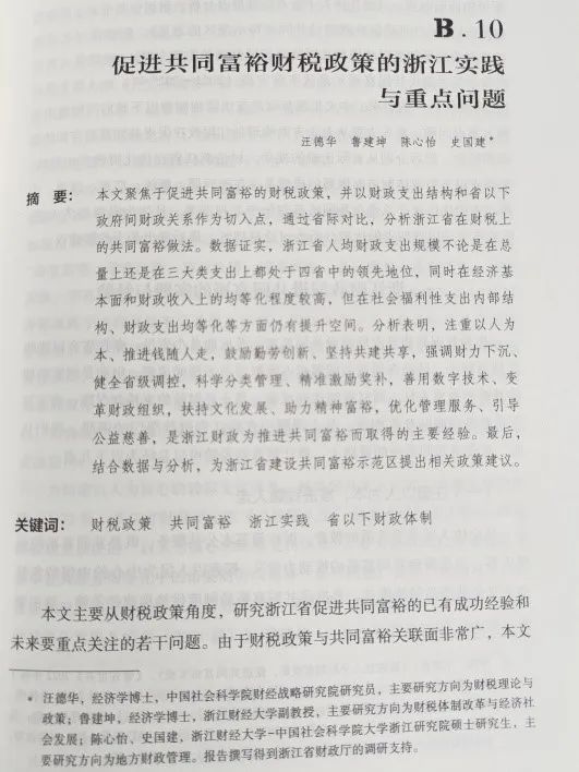 汪德华研究员团队负责蓝皮书专题篇第十章《促进共同富裕财税政策的浙江实践与重点问题》(第217页-274页)的撰写。该章聚焦于促进共同富裕的财税政策,并以财政支出结构和省以下政府间财政关系作为切入点,通过省际对比,分析浙江省在财税上的共同富裕做法。在分析数据与政策的基础上,为浙江省建设共同富裕示范区提出相关政策建议。