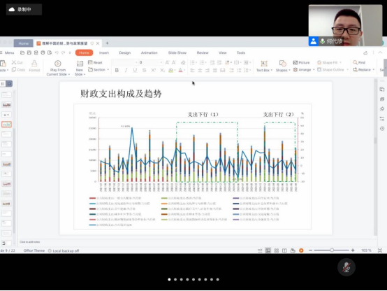 本次讲座中何代欣教授基于“财政收支形式、政府债务情况、财政政策分析”三个维度分析了我国财税形势与政策的变化。此外,何代欣教授结合自身研究与分析,介绍了我国财政的收支构成及近几年的发展趋势,其中系统分析了造成疫情以来我国财政增收陡然困难局面的原因。同时以大量的数据与图表为基础,进一步直观地向同学们展现了中央及地方政府债务支出和变化情况。讲座最后,何代欣教授对同学提出的问题进行了认真细致的回答。
