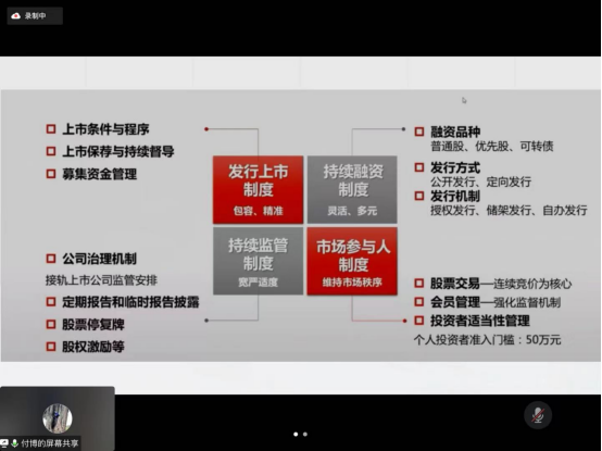 在整场分享会之中,付研究员从“北交所的诞生背景、北交所设立的意义及北交所的概况解读”三个方面展开论述,将北交所与上交所、深交所进行对比,充分展现北交所的独特之处,指出了北交所的设立有利于构建和完善多层次的资本市场体系,意味着以服务中小企业为己任的新三板将站上改革新起点,中国资本市场改革发展又迈出关键一步,他还对注册制内容、北交所的重要规则做了详细的介绍。讲座尾声,付研究员对师生们提出的问题进行了认真细致的回答。