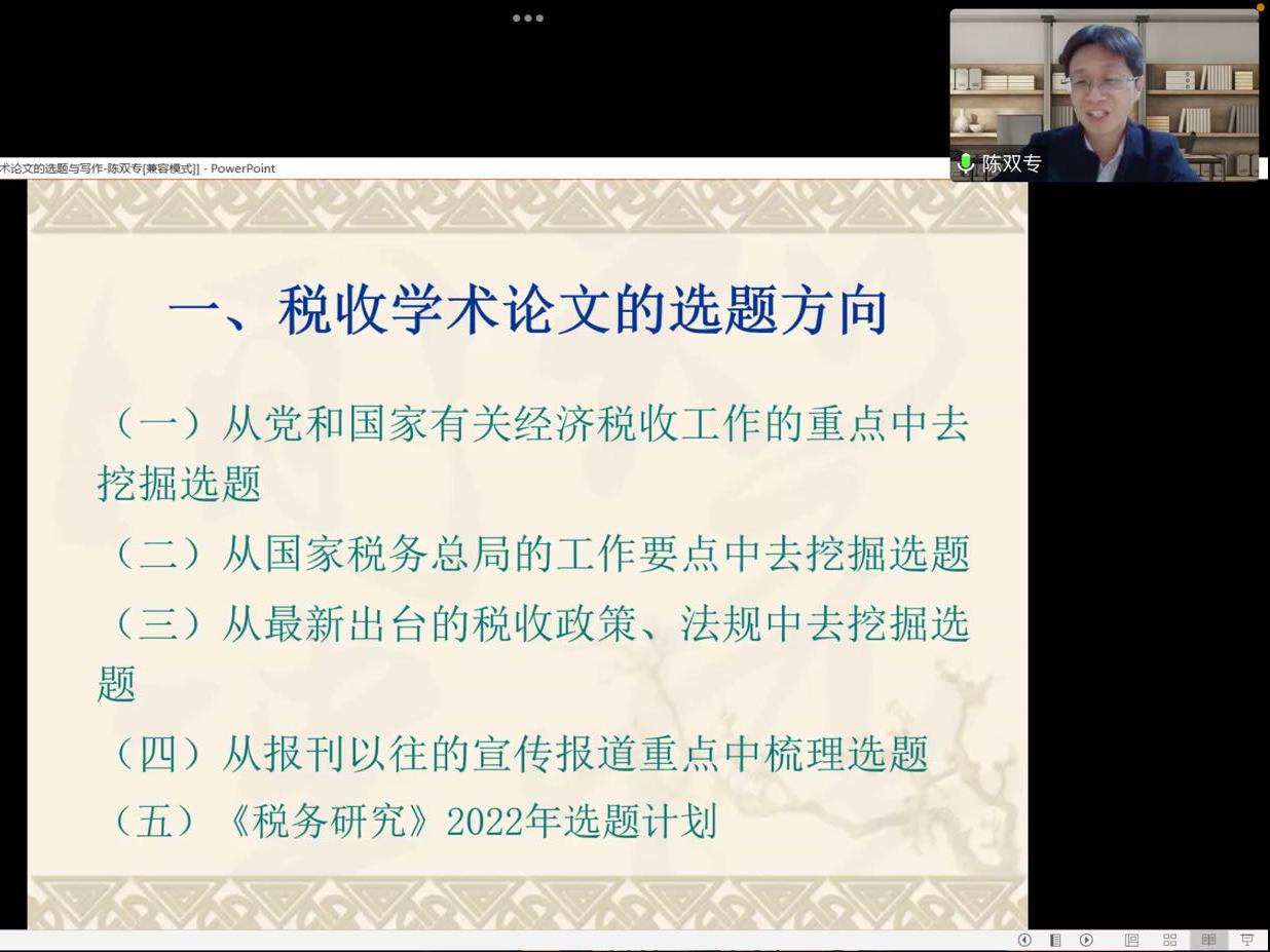 3月23日晚,《税务研究》杂志编辑部副主任(主持工作)陈双专编审应邀分享了主题为“税收学术论文的选题与写作”的讲座。本次讲座由中国p站