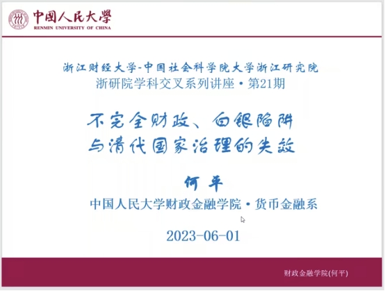 6月1日晚,中国人民大学财政金融学院货币金融系教授、金融学博士生导师、中国金融学会金融史专业委员会副主任何平应邀作题为“不完全财政、白银陷阱与清代国家治理的失效”的专题讲座。本讲座由中国p站