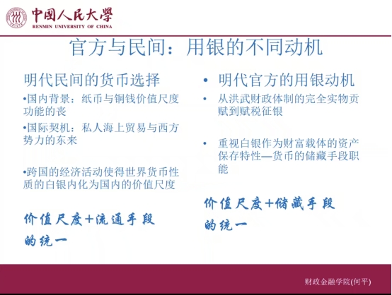 何平教授首先从清代官俸之薄“亘古未有”、地方公费缺乏、常额军费的不足这三个方面阐述了不完全财政体制及其内涵,指明了不完全财政对清朝政府行政的双重后果是“国”与“民”的两害,具体包括国家税收失控与民众负担加重,并针对这些后果提出了养廉银制度的补救之道与新的缺口,由此引发了对专制制度与时势变迁的思考,梳理了专制制度的演变过程,点明了时势变迁的催化作用;其次,何平教授从流通手段与储藏手段的统一谈到流通手段与储藏手段的冲突,指出“官”与“民”对于白银所发挥的货币职能的不同解读,引发影响至深的“白银陷阱”。最后,童光辉副教授对讲座内容进行了简短性总结,并期待与何平教授在杭州见面。