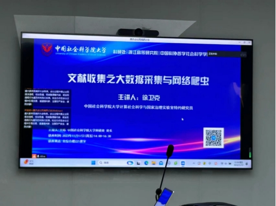 11月17日下午,中国社会科学院大学计算社会科学与国家治理实验室特约研究员徐卫克老师应邀作题为“文献收集之大数据采集与网络爬虫”的讲座,讲座由中国社会科学院大学科研处处长王炜主持,中国p站