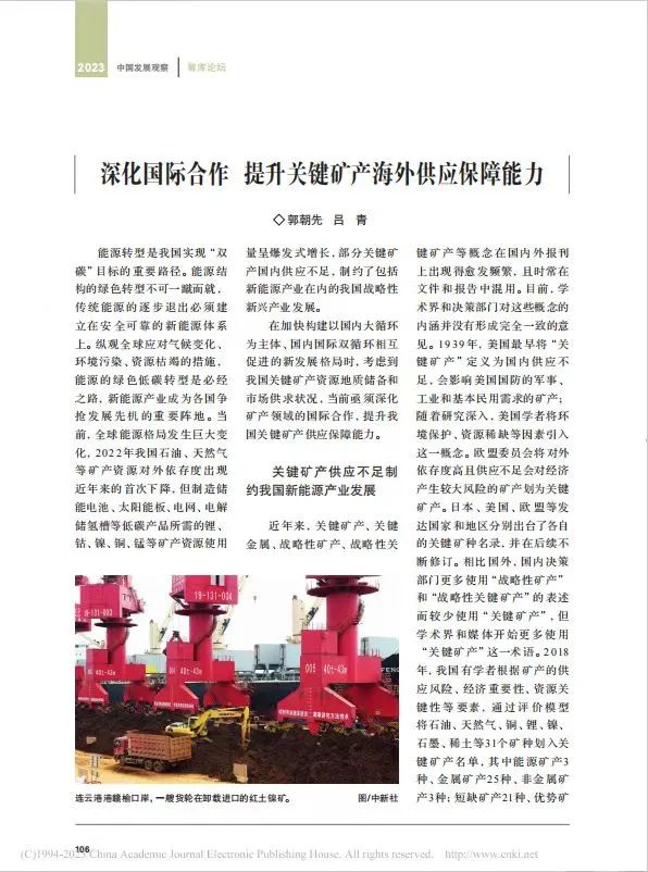 2021级产业经济学专业研究生吕青同学和中国社会科学院大学导师郭朝先教授合作的文章《深化国际合作 提升关键矿产海外供应保障能力》在《中国发展观察》2023年第6期发表。文章研究分析了我国当下新能源发展过程中部分关键矿产缺失的现状,并基于新发展格局的构建提出建议。