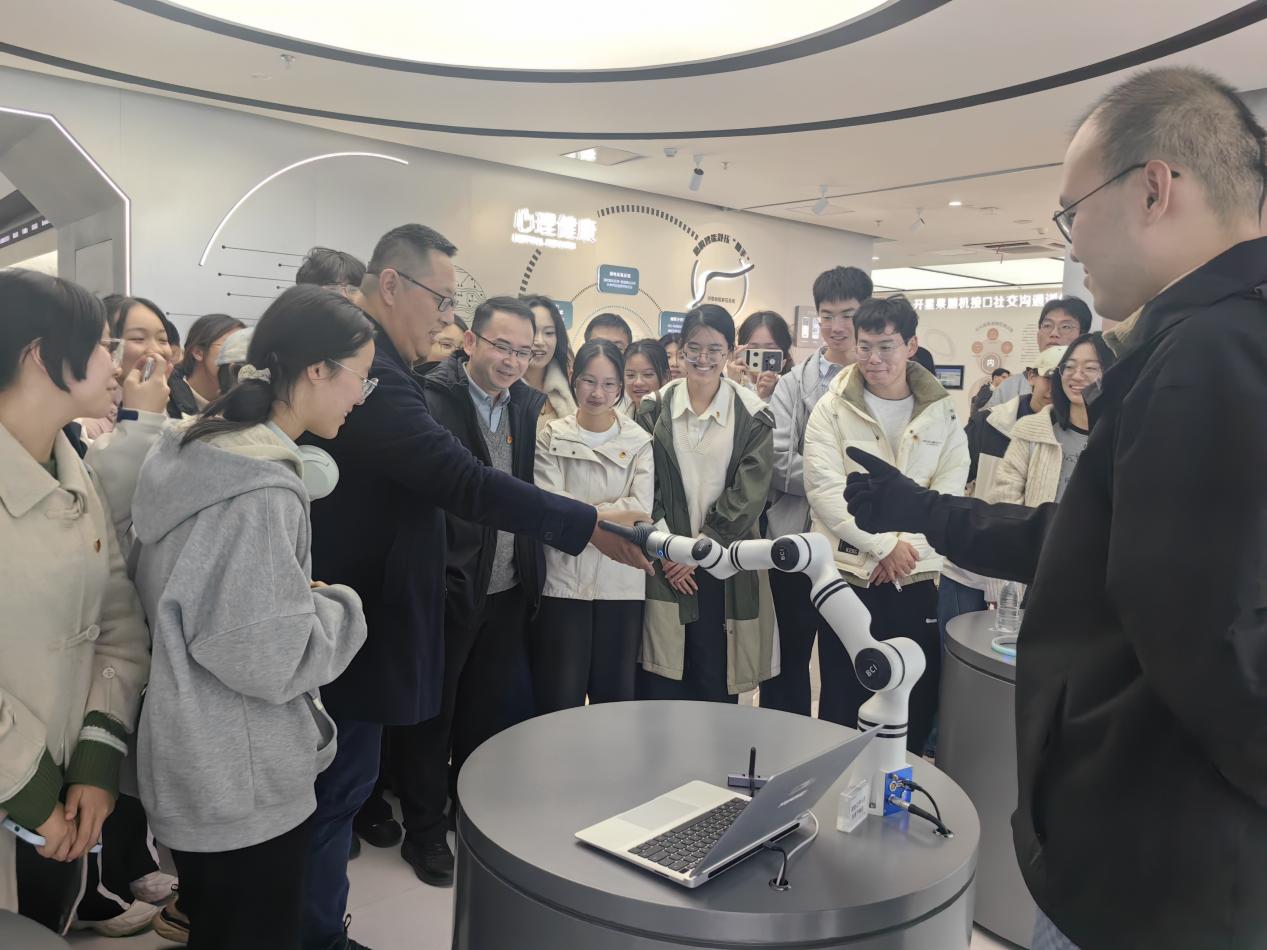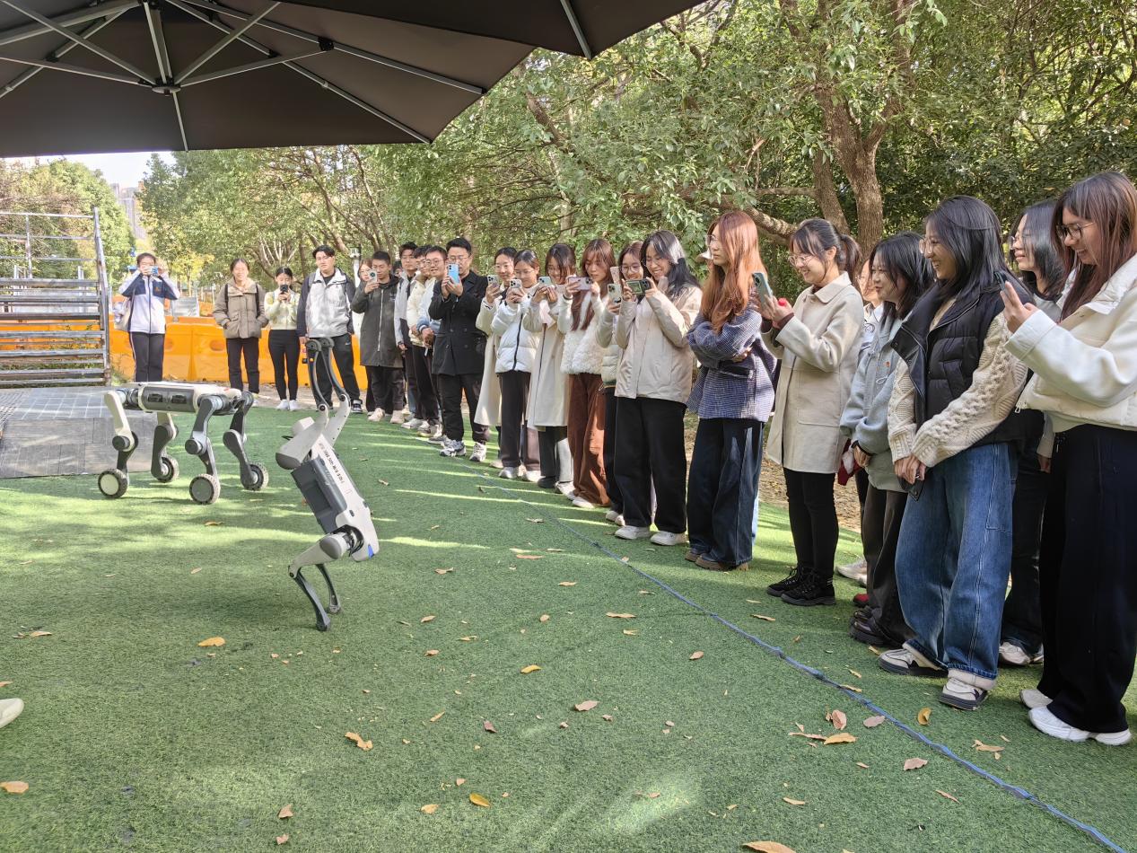 在云深处科技有限公司,师生们近距离感受机器人产业的创新成果与发展活力,并详细了解公司的发展历程、核心技术、多款功能各异的机器人产品及其在不同领域的应用案例。在随后的座谈会上,企业负责人以“四足机器人技术演进与行业赋能”为题,系统介绍了从实验室研发到产业落地的创新历程。师生们结合财经专业背景围绕“机器人产业链投资逻辑与政策导向”“机器人技术在民生领域的拓展路径”等问题踊跃提问,展现了跨学科思维在理解科技创新中的独特价值。现场气氛热烈、思想碰撞不断,师生对新时代青年服务国家战略的使命与方向有了更清晰的认识。