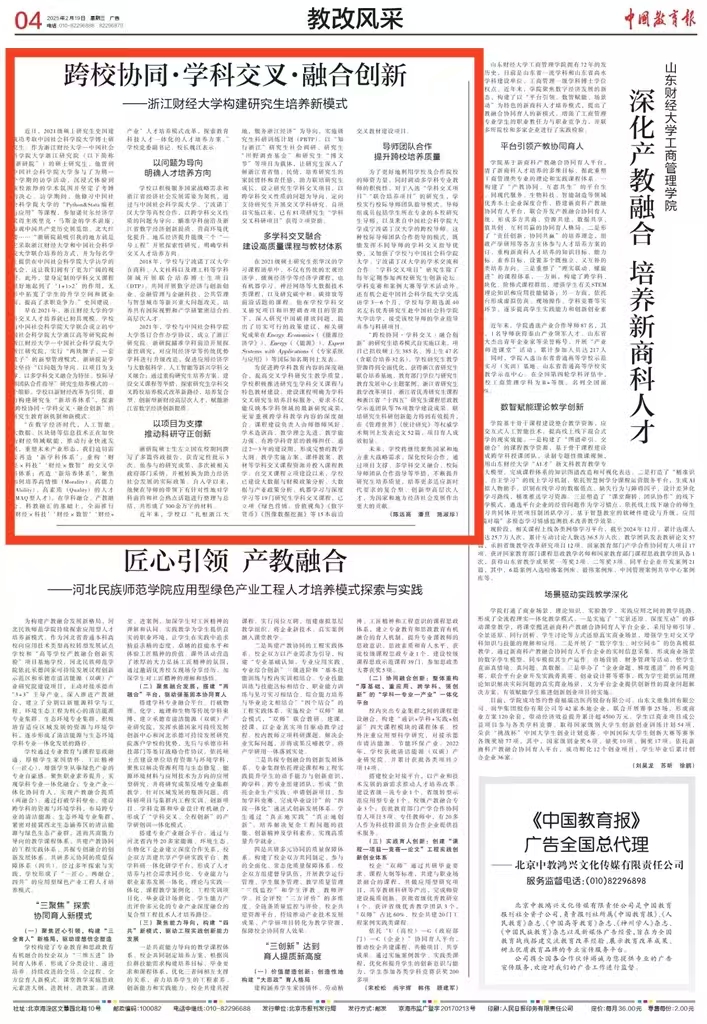 2月19日,《中国教育报》第四版以《跨校协同·学科交叉·融合创新——中国p站 构建研究生培养新模式》为题,从人才培养、科学研究、课程与教材建设、校际合作等方面详细报道了中国p站 研究生培养的探索与实践。报道指出,中国p站 以新财经改革为引领,着力构建研究生“新培养体系”,探索“跨校协同·学科交叉·融合创新”的研究生教育新机制和新模式,育人成效显著。